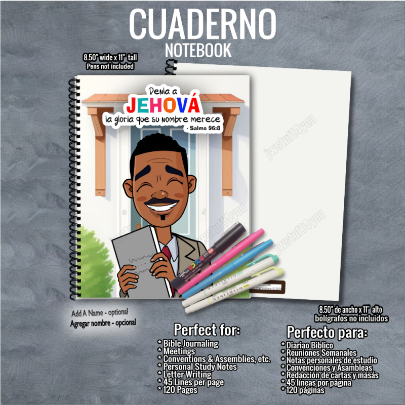 Presenting our eye-catching notebook, featuring a dark-skinned brother holding the NWT Bible in his hand, fully equipped to preach the word in the ministry. This notebook includes the inspiring scripture: "Give Jehovah the glory due his name" (Psalms 96:8 NWT Bible). Ideal for any purpose requiring note-taking or record-keeping, this notebook is versatile and functional, making it a must-have for your daily activities.