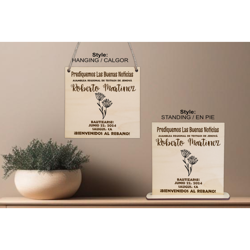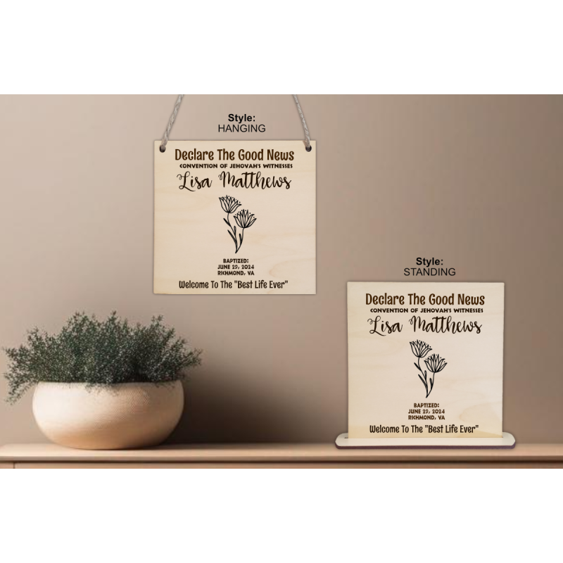 Description: This engraved plaque is the perfect gift to commemorate the sacred occasion of getting baptized and dedicating one's life to Jehovah. Made from high-quality 100% light wood species, such as basswood, birch, or maple, it is an elegant keepsake for this significant day. The design features the person's name, location, date of baptism, and a beautiful floral motif.