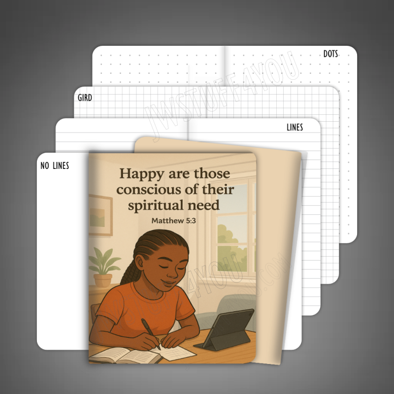 Whether you are jotting down field service points, keeping track of return visits, or simply capturing a quick thought before it’s gone, this mini notebook is built for life on the go. The cover features a peaceful illustration of a girl immersed in her personal study surrounded by books, paired with the timeless scripture: "Happy are those conscious of their spiritual needs" (Matthew 5:3).