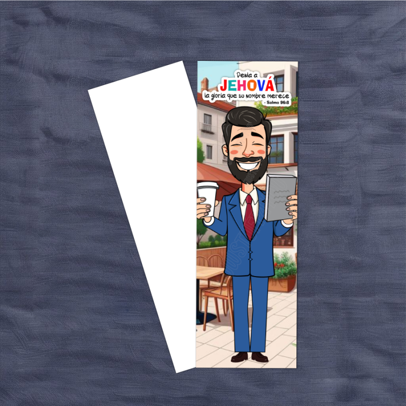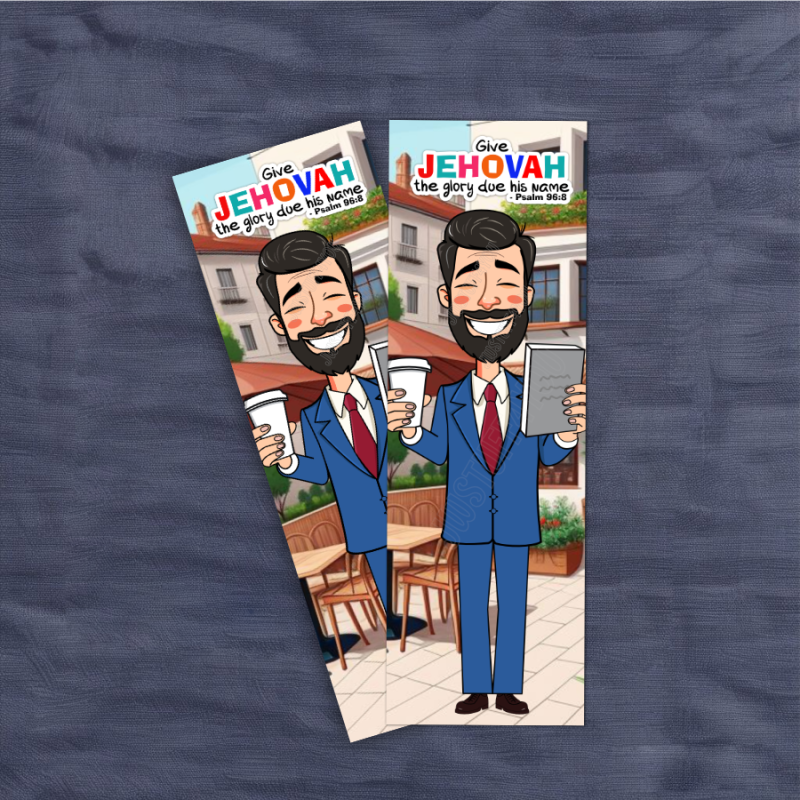 This bookmark captures a light-skinned brother taking a well-deserved coffee break during his ministry. With Psalm 96:8 displayed—“Give Jehovah the glory due his name”—the design reminds us that even in moments of rest, our focus remains on glorifying Jehovah. After his pause, he continues his ministry refreshed and encouraged.