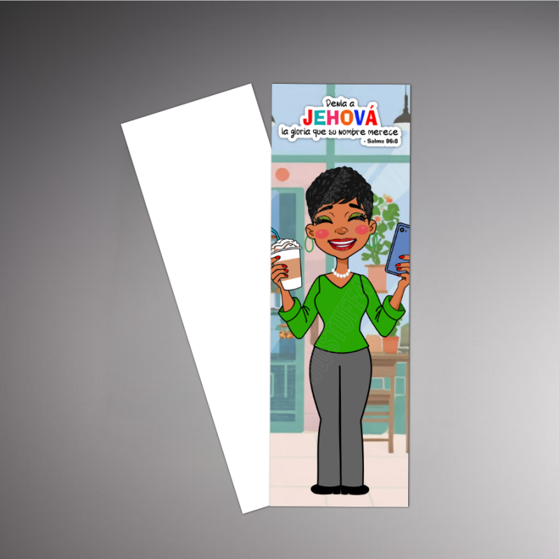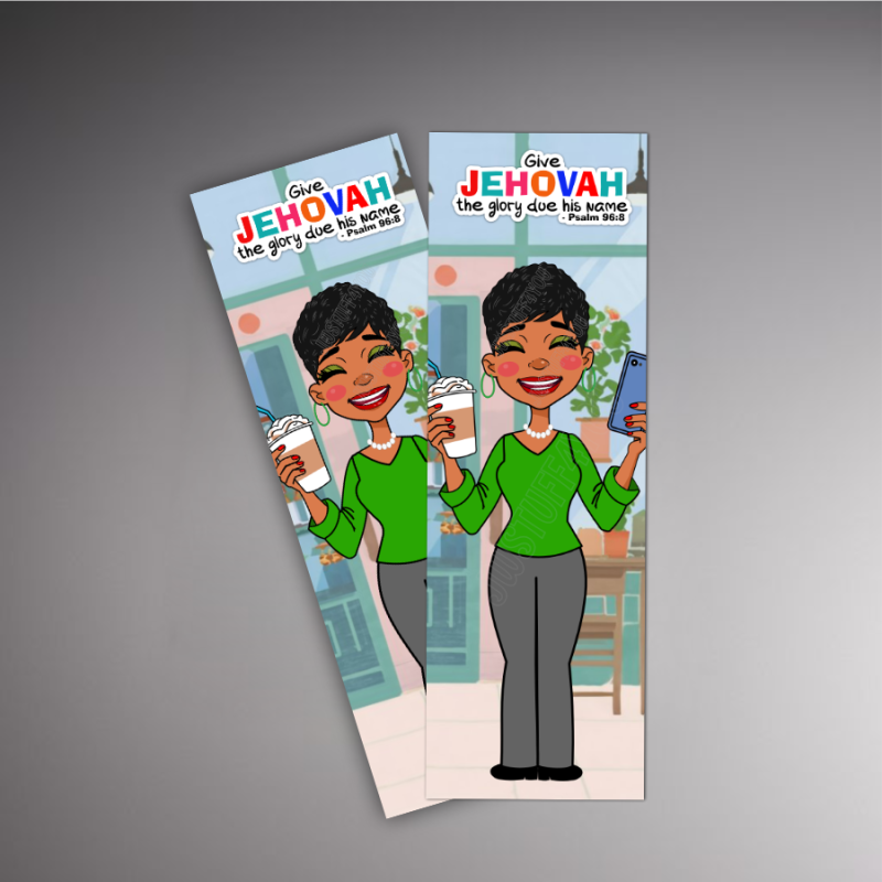 This bookmark features a dark-skinned sister enjoying a break, holding her warm coffee latte drink in one hand and her NWT Bible in the other. She’s taking a short pause between preaching the good news, ready to continue her ministry refreshed and encouraged. The design is anchored by Psalm 96:8: “Give Jehovah the glory due his name.” It’s a meaningful reminder that even in moments of rest, our focus remains on glorifying Jehovah.