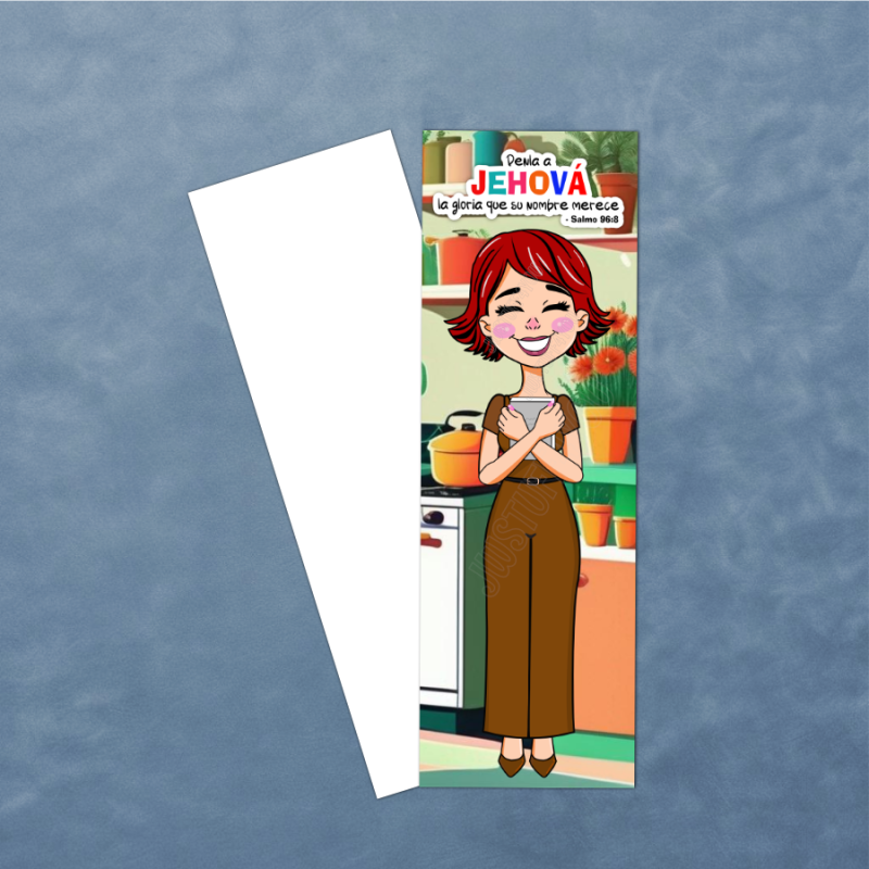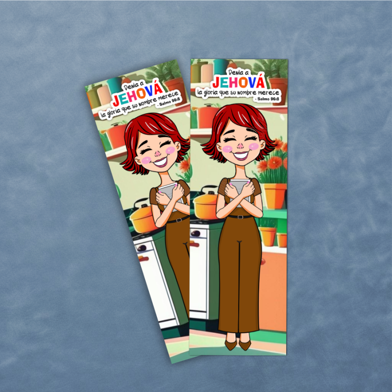 This cozy and uplifting bookmark features a light-skinned sister standing in her kitchen, holding her NWT Bible—the essential tool for her day in field service. With Psalm 96:8 as its theme, it’s a gentle reminder to give Jehovah the glory in every moment, from home to territory.