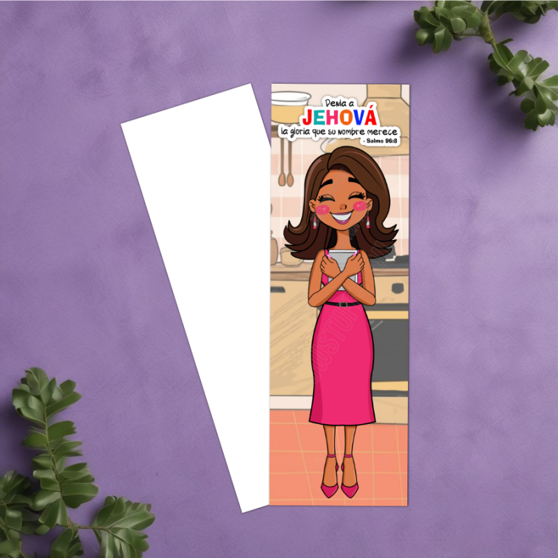 This bookmark features a dark-skinned sister standing in her kitchen, ready to begin a full day of service. With her NWT Bible held close to her chest, arms crossed protectively around it, she is well equipped to share the good news. The design is anchored by Psalm 96:8: “Give Jehovah the glory due his name.” It’s a powerful reminder of the strength and joy that comes from starting the day prepared for ministry.