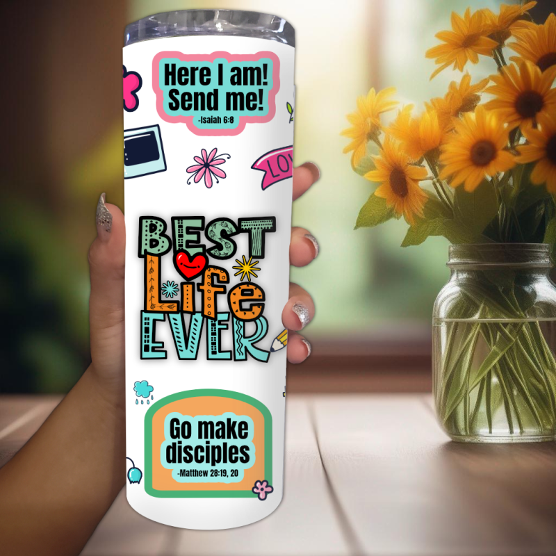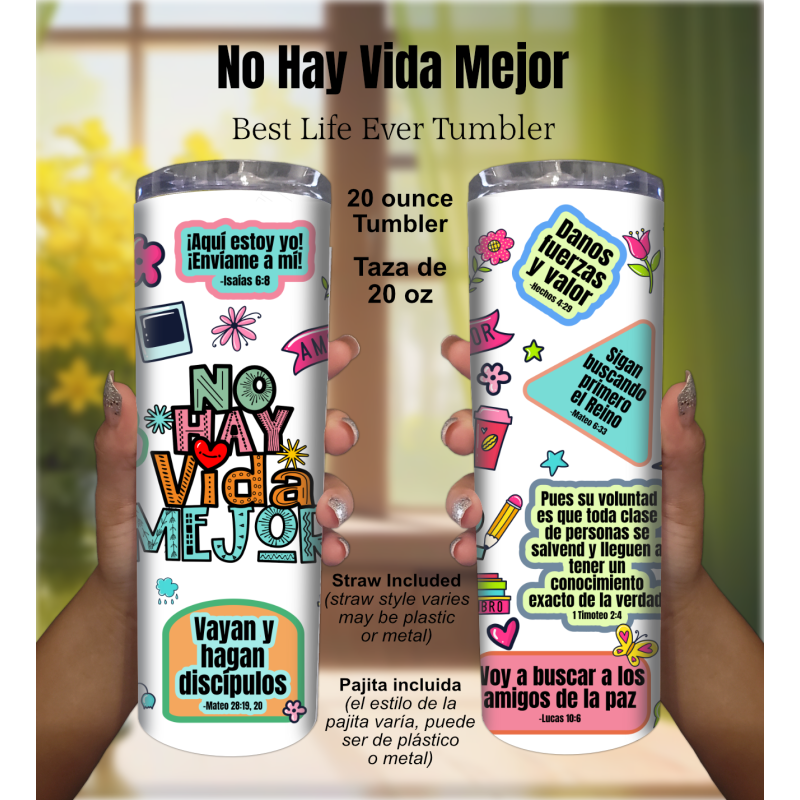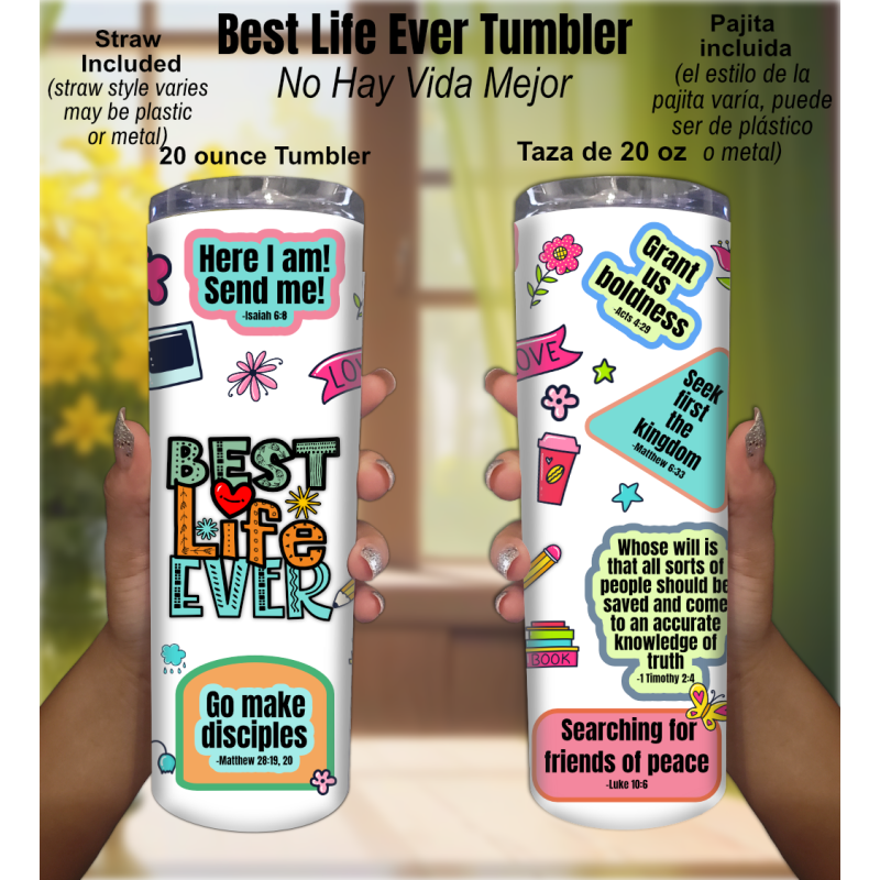 This lovely and beautifully vibrant Best Life Ever tumbler (No Hay Vida Mejor) is stainless steel and easy to clean. Our skinny style tumbler holds 20 ounces of liquid without being bulky. Comes complete with straw. *STRAW STYLE/MATERIALS MAY VARY* The double walled insulation allows you to keep the hot stuff hot and cold stuff cold! The full color design wraps beautifully around the tumbler and contains various encouraging bible quotes from the NWT Bible!"